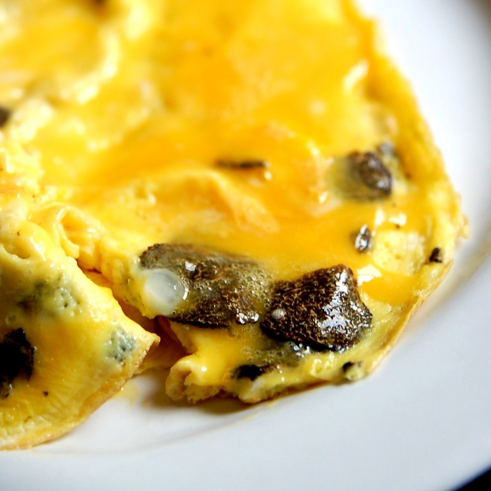 このようにして濃厚なトリュフの風味が移った卵を、【ふらかつ】はふわとろのオムレツや半熟の目玉焼きにするのが好きです。トリュフそのものはスライスしてトッピング的に使い、火をほとんど入れないのがポイント。